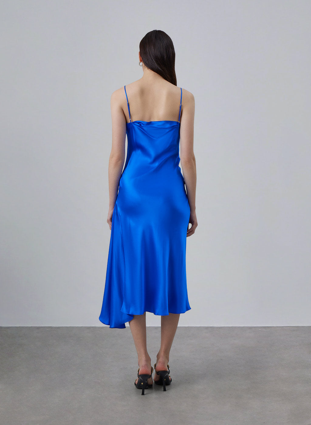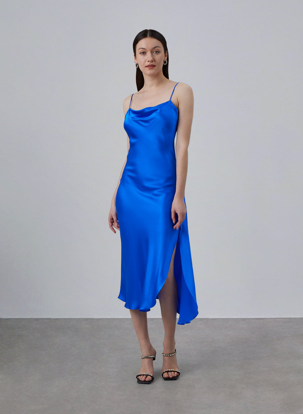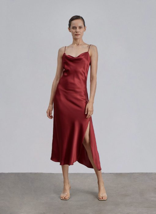 Experience all your elegant dreams in this bias-cut silk slip dress. Crafted from 100% mulberry silk, this midi features a cowl neckline and a dramatic side slit. The piece uses a flawless bias-cut process, which tends to stretch over time and during wear. A perfect choice for your next date night dress! Cowl neckline Bias cut Side slit Adjustable shoulder straps