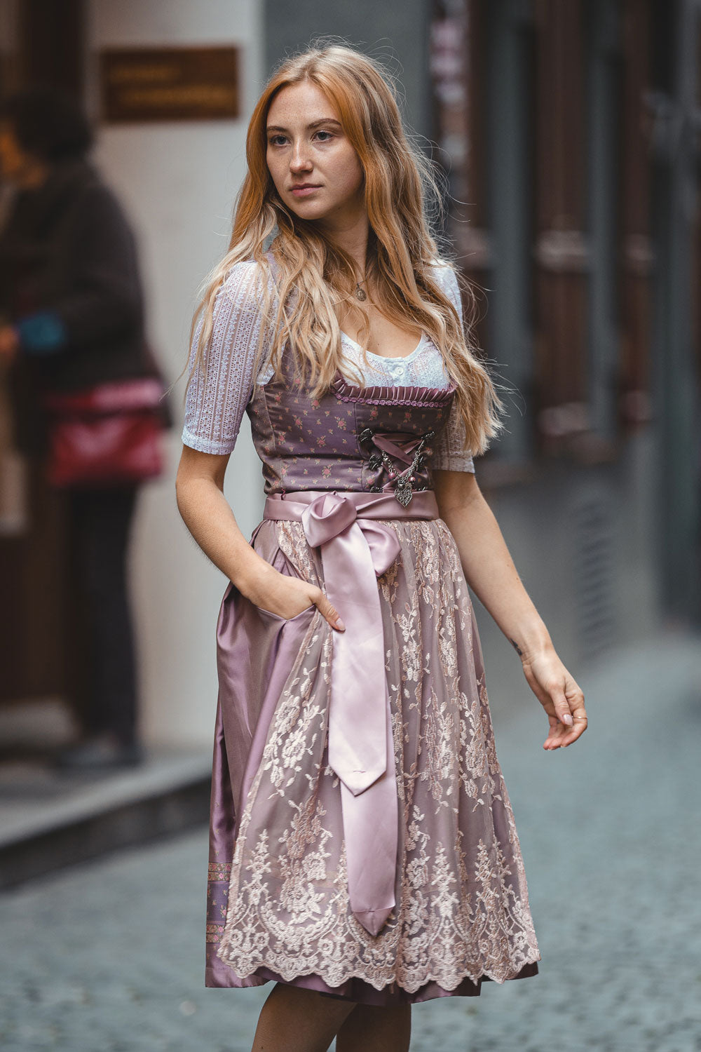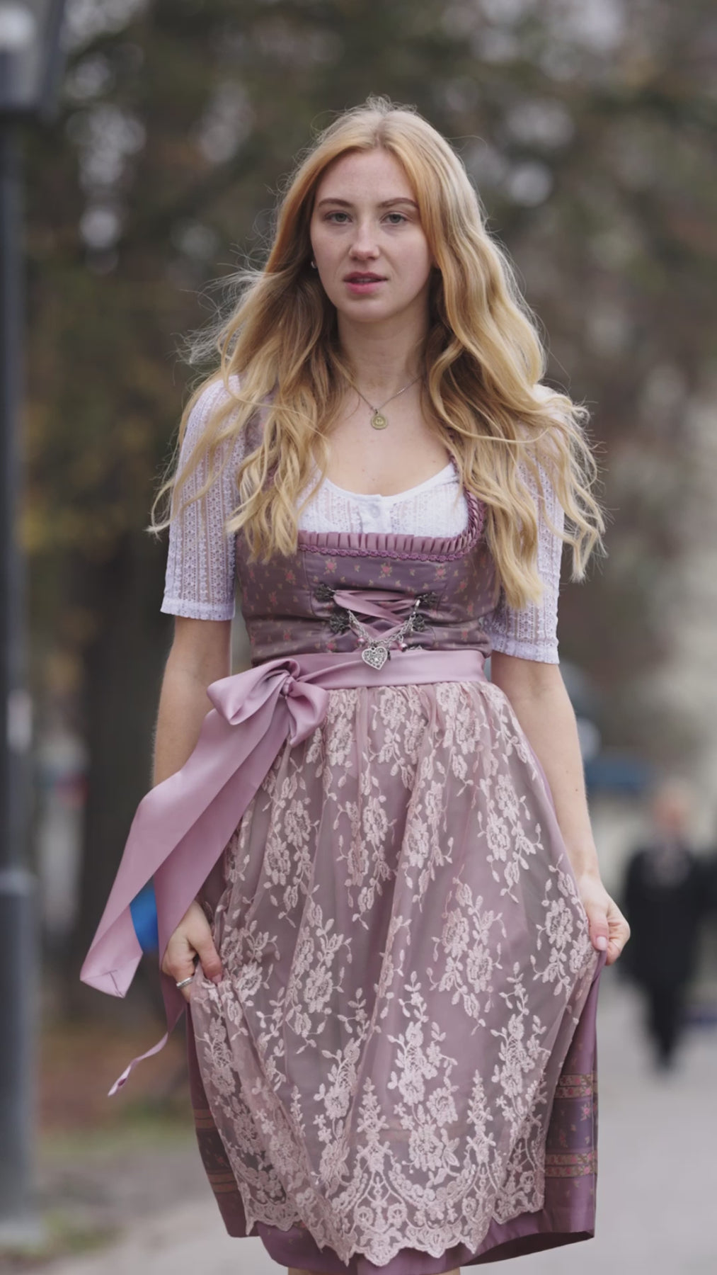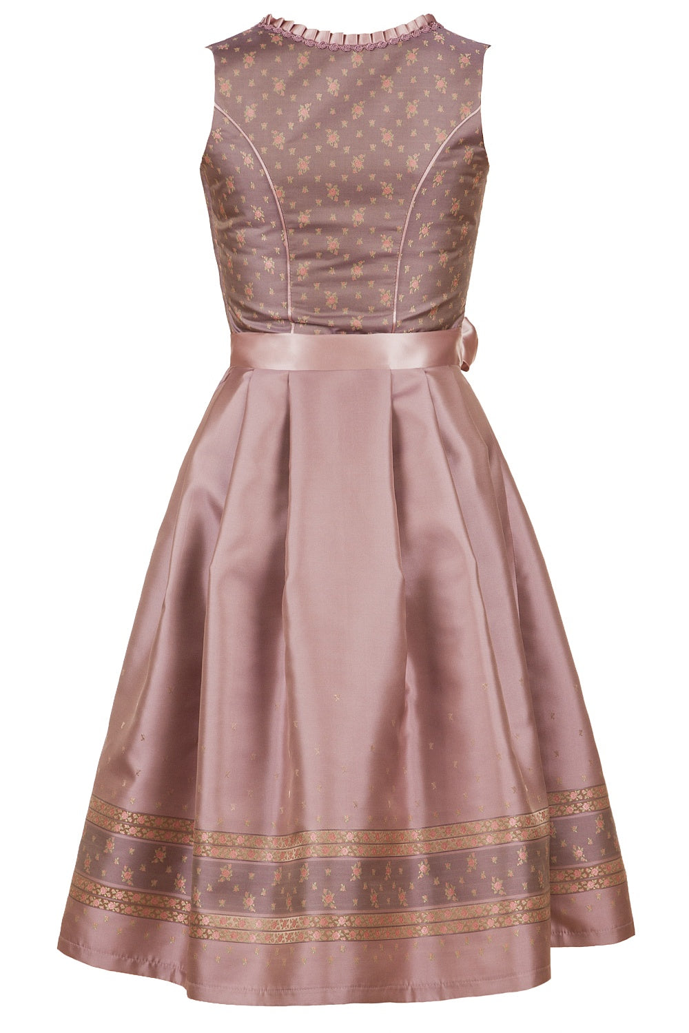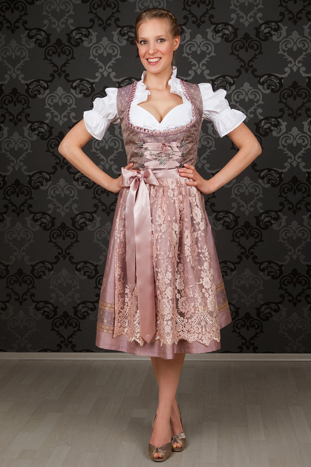The light purple shimmering brocade fabric of the top is decorated with fine roses and thus harmonizes perfectly with the gold-rose colored skirt of the dirndl. The neckline is framed by a hand-made ruffled border and sweet roses. Fine satin piping on the back gives the dirndl extra elegance and delicacy. A special highlight is the generously decorated pink lace apron, which together with the hand-made dirndl chain, the so-called charivari, makes every traditional costume and princess' heart beat faster. The charivari is attached with snap hooks.
