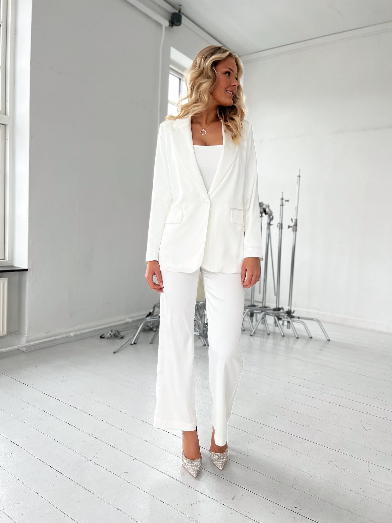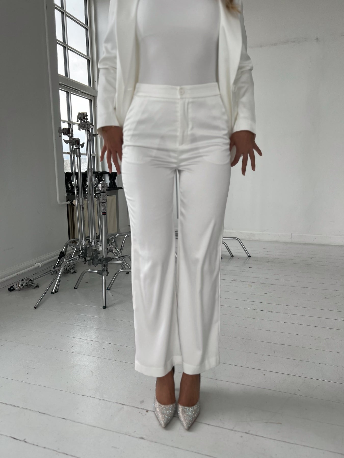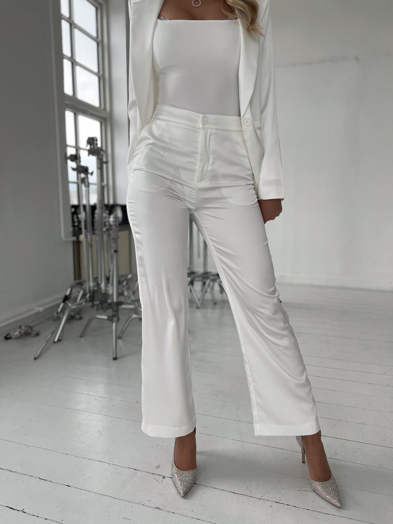 Beautiful white satin-like pants. The pants have pockets in the front and decorative pockets in the back. The pants have a nice hem that is comfortable to wear. Perfect for confirmations/students and or festive occasions.