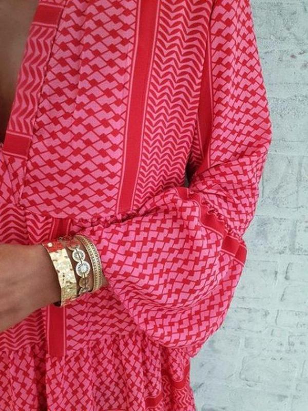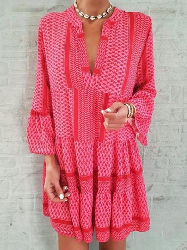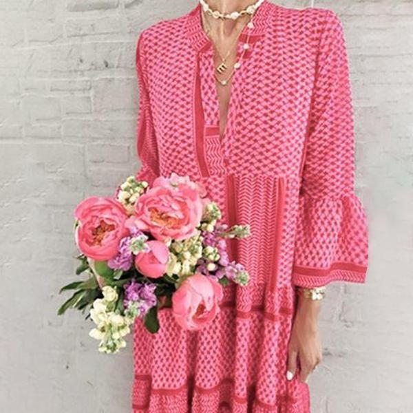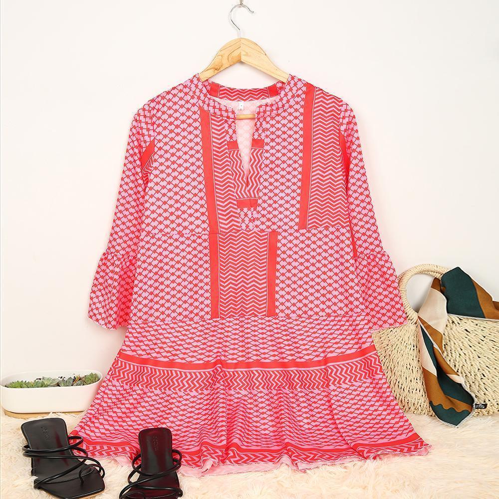 Designed in hot pink, this dress should be on your wish list if you’re seeking effortless summer style. Woven in one of our signature silhouettes, the bright, geo-print dress features a split neck, belled bracelet sleeves and flouncy tiers. Wear it on dates, to class or to brunch with your besties.